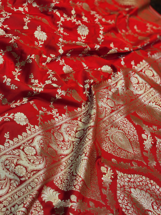 Bridal Red Mashru Silk Banarasi Saree With Jaal Pattern