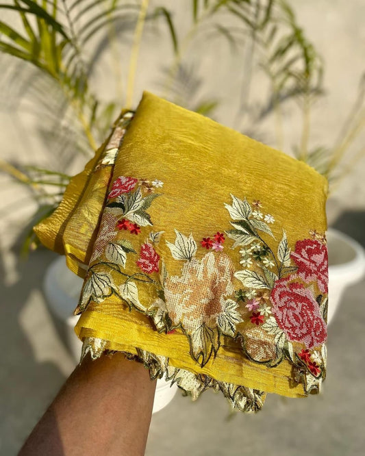 Maharani Collection Gold Embroidery Crushed Tissue silk saree