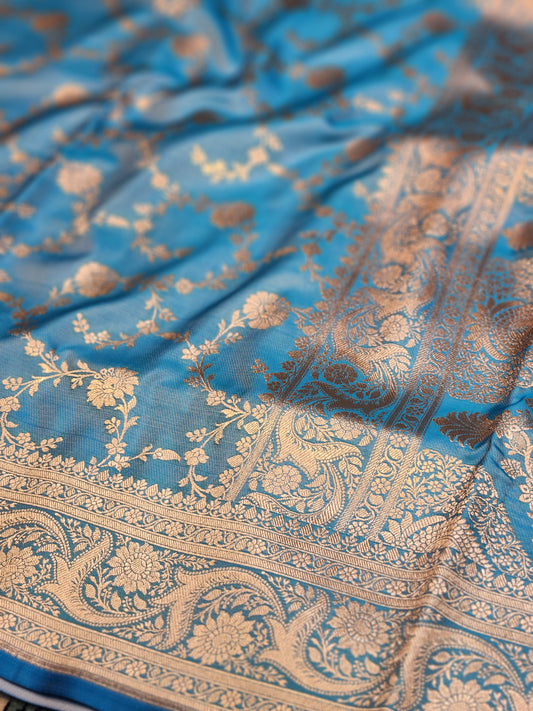 Sky blue Mashru Silk Banarasi Saree Jaal Pattern