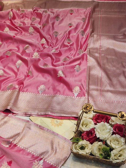 Strawberry Pink Mashru Silk Banarasi Saree With Meena bootas